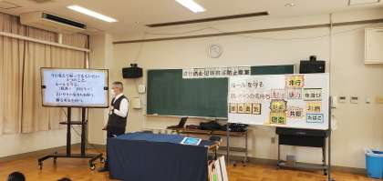 非行を防止するためには、「ルールやきまりを守ることが大切であること」、犯罪に巻き込まれないためには「勇気を持って断ることが大切であること」などを学びました。「非行」という言葉を初めて知った子、「犯罪」は自分とは程遠いものだと思っていた子が多かったようですが、自分の身近に起こるかもしれないことを知り、真剣に考える機会となりました。最近は、スマートフォンやSNSで犯罪に巻き込まれるケースも増えているそうです。思いやりの気持ちをもつこともまた非行防止に繋がることを学びました。