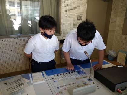給食時間に健康委員会のメンバーが放送で、朝晩の歯みがきや給食後のブクブクうがい実施の呼びかけを行っています。