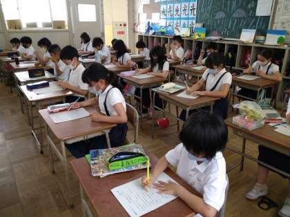 写真は4年生の学級の様子です。映像を見た後、健康委員会からのアンケートを配布し、担任の先生と一緒に、内容の振り返りを行いました。