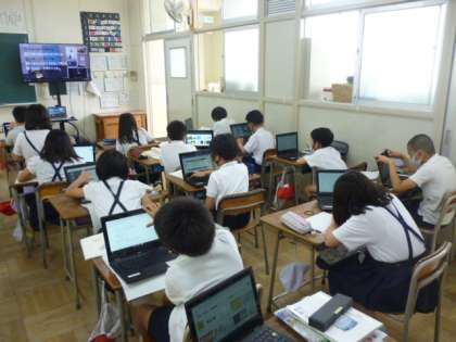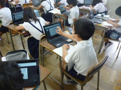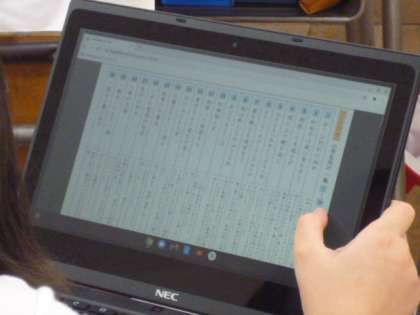 4年生が「ことわざ」の学習をしていました。学習のめあてや学習の進め方を確認した後、一人一台学習者用端末を活用して、自分が調べたい「ことわざ」の意味や使い方について調べ、ノートにまとめていました。子どもたちは手慣れた様子で、キーボードで文字を入力したり、画面を指で操作したり、熱心に調べ学習に取り組んでいました。