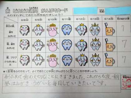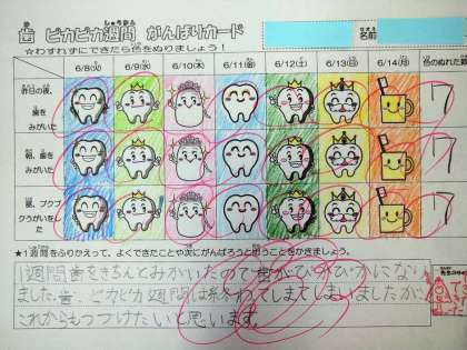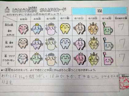 歯と口の健康のためには、食後の歯みがきが大切です。そこで、朝晩のはみがき、給食後のブクブクうがいを行うことができたら「がんばりカード」に色ぬりを行うという取組を行いました。また、今回は土日も含めて実施を行いました。