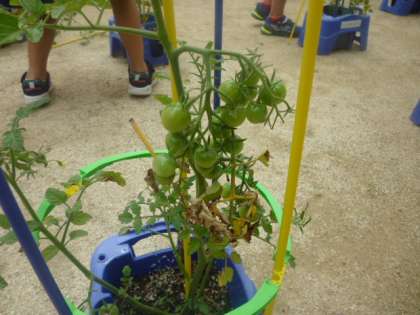 2年生が5月中旬に植えたミニトマトが大きく成長し、今日、支柱を立てていました。実もたくさんできており、中には、赤く熟しているものもありました。これから、実がどんどん赤くなっていくのが楽しみですね!