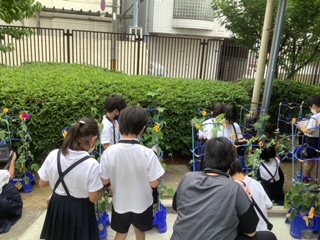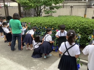 1年生のあさがおが、たくさん咲きだしました。まだ咲いていないものも、つぼみがたくさんついています。6日の1時間目には、タブレットであさがおの様子を写真に撮りました。「まだまだ、たくさん咲いてほしい。」とのつぶやき。みんなの水やりと、お日様が栄養です。これからも、お世話をよろしくね。