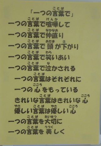 9月21日(火)の全校朝会で、校長先生から『一つの言葉で』という詩の紹介と『ふわふわ言葉』についてのお話がありました。子どもたちは、良い姿勢で校長先生のお話に耳を傾けていました。人が嫌な気持ちになるような「ちくちく言葉」を使うのではなく、『一つの言葉』を大切にし、『ふわふわ言葉』を使うことで、より良い人間関係を築きあげていきたいものですね。