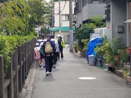 1・2年生が「元浜緑地公園」への校外学習に出発しました。先生からのお話を聞いた後、元気に出発しました。気をつけて行ってらっしゃい!