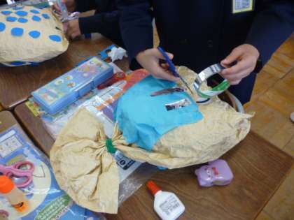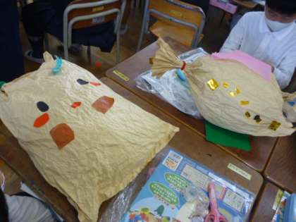 図工「くしゃくしゃぎゅっ」の学習。想像を広げ、楽しく作品づくりに取り組んでいました。