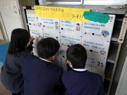 保健室前の掲示物も、普段の自分の姿勢に問題がないかをチェックする質問を掲示しています。「はい」「いいえ」に〇印をつけて熱心に見ています。