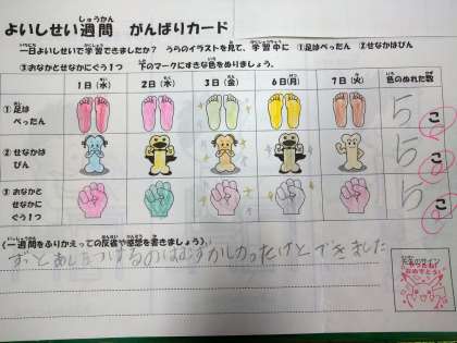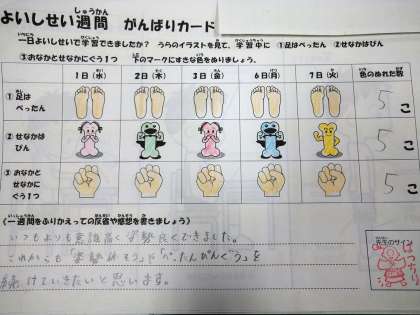 良い姿勢の合言葉「ぺったん ぴん ぐう」を意識して1週間過ごすことを目標に、達成できた項目については、毎日がんばりカードに色をぬっていました。
