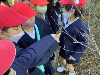 校庭でのふゆみつけに続き、あきみつけにも訪れた新佃公園とふれあい公園に冬を探しに出かけました。「赤い葉っぱどうなってるかな。」「どんぐりあるかな。」と、それぞれ見るポイントを絞りながら出かけました。公園につくと、「葉っぱがない!」「どんぐりの色が変わってる。」とたくさんつぶやきながらまわりました。コブシのような樹にふわふわの冬芽を見つけ、触ることもできました。