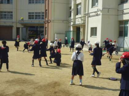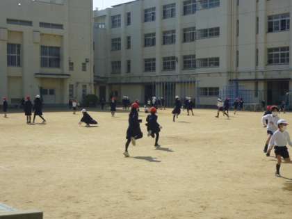 2時間目終了後の休み時間、子どもたちの声に誘われて運動場を見てみると、春の日差しを思わせるような晴天のもと、元気に遊ぶ子どもたちの姿が目に飛び込んできました。ドッジボールや鬼ごっこをして遊んでいる姿や先生も一緒になって遊んでいる姿は、とても微笑ましかったです。