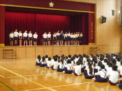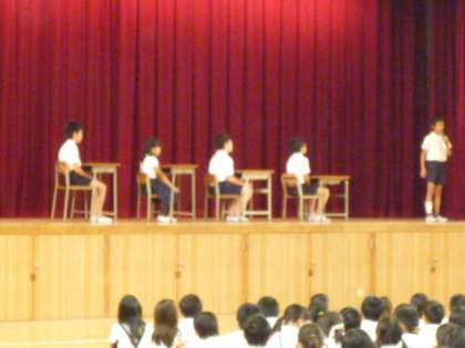 6月2日(火)、児童集会で健康委員会の人たちが、学習中の正しい姿勢について発表しました。悪い例やよい例を実際に見せてくれて、わかりやすく説明してくれました。