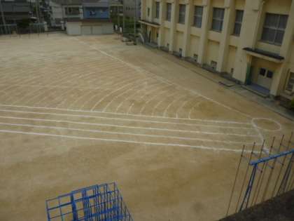 運動場に白線がたくさんあります。23日から行う「新体力テスト」のための白線です。