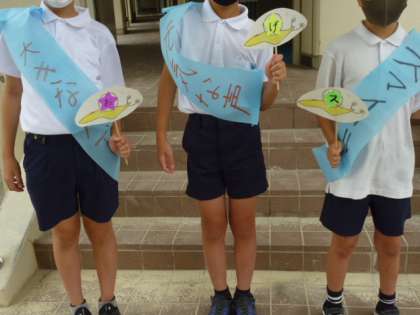 あいさつ週間では代表委員会の児童が率先してあいさつをがんばりました。面と向かって声をかけるようにしたり、イショウ(さわやかな水色のタスキや「つく来夢」のお面、「つく来夢」のカタツムリ)を工夫したりして、盛り上げました。そのおかげで児童の声がひびきわたる一週間でした。