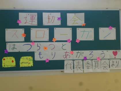 運動会の練習が佳境に入ってきました。児童は久しぶりの運動会の開催に、はりきって練習に臨んでいます。今年のスローガンは「はつらつと もりあがろう!」です。全校児童から募集して集まった言葉・・・元気いっぱい・力の限り・最後まであきらめずに・応援しよう・協力しよう・・・を表すスローガンとなっています。
