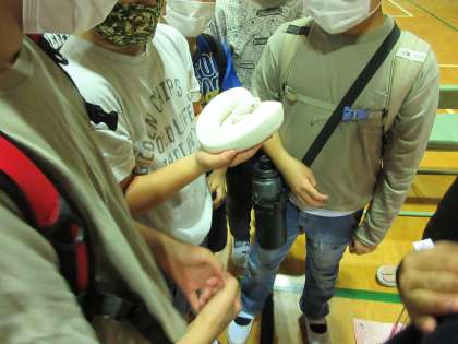 お昼から、保護者会主催のいきもの展示・ふれあいミニ動物園が開催されました。子どもたちは、最初は怖がりながらも、爬虫類や両生類などいきもののと触れ合うことができました。