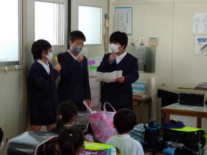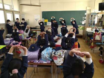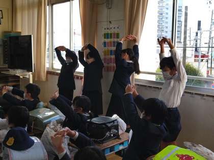 12月2日(金)の5時間目終了後、健康委員会の児童と1年生が一緒に「しせいたいそう」を教室で行いました。