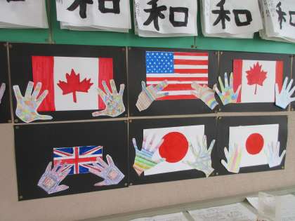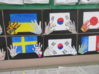 サッカーのワールドカップに合わせて、図工の授業で世界の国旗を描き、自分たちの手(デザインは、幾何学模様)を貼り付けました。