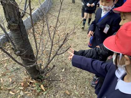 2月1日、寒さはあるものの天候に恵まれた水曜日、新佃公園とふれあい公園に冬みつけに出かけました。葉っぱがなくなってしまった枝を見て、「さみしいな。」「寒そうだな。」とのつぶやき。学校での冬みつけでも見つけた冬芽を探して回りました。大きいもの、小さいもの、緑色、ピンク色、いろいろな冬芽を見つけました。そして、毛におおわれた冬芽も発見!そうっと触らせてもらいました。冬芽の中では春への準備が進んでいます。春になって、冬芽が枝や葉、花になるのをお楽しみに!冬芽探しの後は、ブランコや遊具、鬼ごっこで遊びました。寒い中でも元気いっぱいの1年生です。