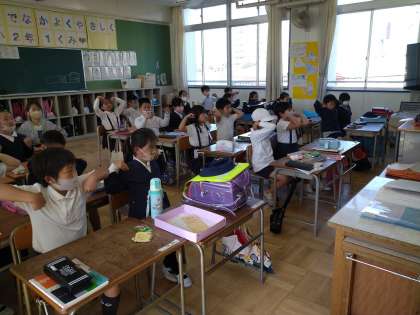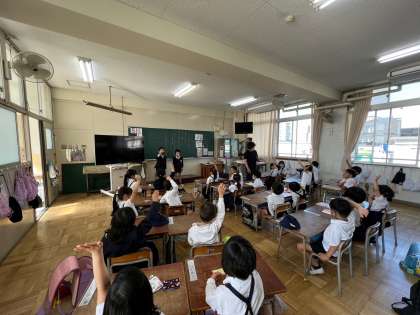 その後、保健委員会の子ども達は、少し緊張しながらも「はんかちをもってきた人は、手を挙げてください。」などと、大きな声で質問をしていました。