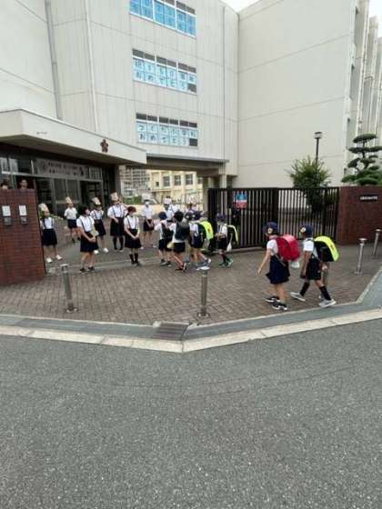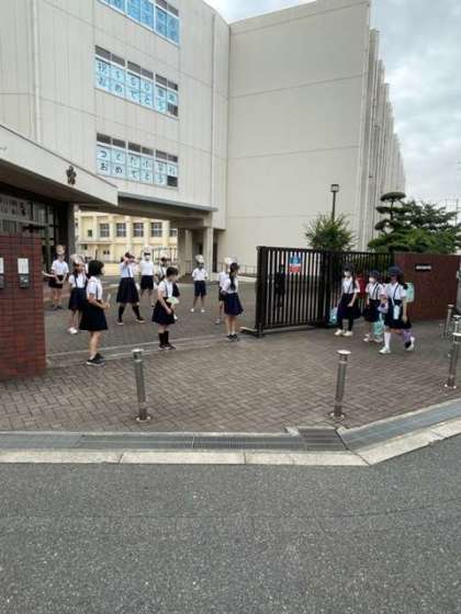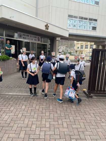 代表委員会のみんなが玄関に立って、あいさつをしています。