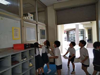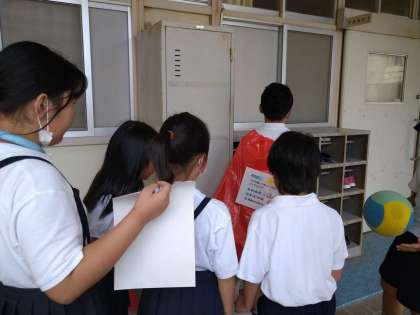 初日からたくさんの児童がクイズの問題を探して校内を歩いています。