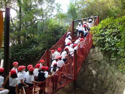 10月5日(月)、4年生は校外学習で須磨離宮公園に行き、フィールド・アスレチックをグループで協力し合って楽しみました。海洋冒険物語「宝島」をテーマに作られた28ポイントのコースで、体力づくりをしながら森林や自然を体感できました。その後、お弁当を食べ、広場の遊具で遊び、楽しく過ごしました。