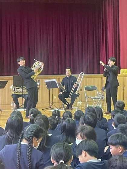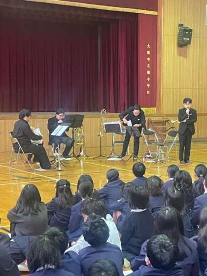 金管楽器の五重奏による素晴らしい演奏で、1年生から6年生まで全員が熱心に聴いていました。