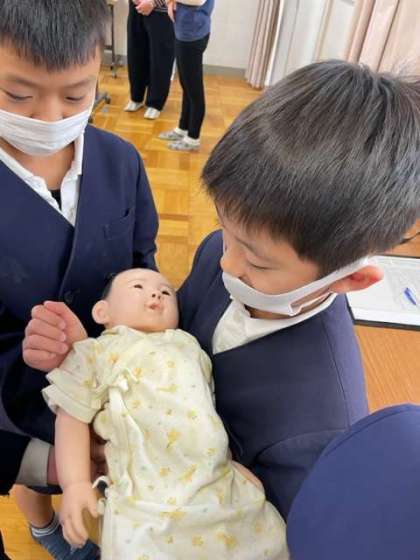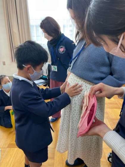 妊婦さんのおなかを触らせてもらったり、赤ちゃんの人形を抱っこしたりしました。