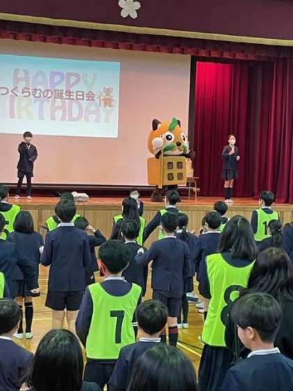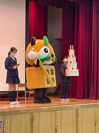 クイズの後、児童のメッセージを貼った大きなケーキをつくらむにプレゼントしました。
