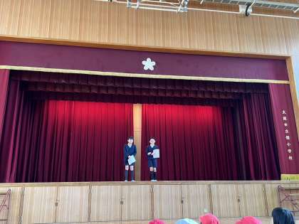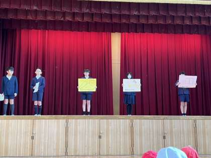 6日の児童朝会時に、保健委員会の児童5名が司会役と元気な児童役に分かれ、全校児童にむけてインフルエンザ予防のために大切なことを知らせました。