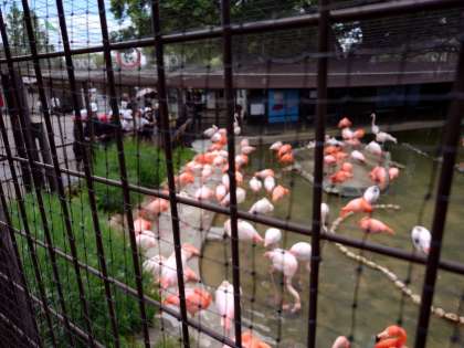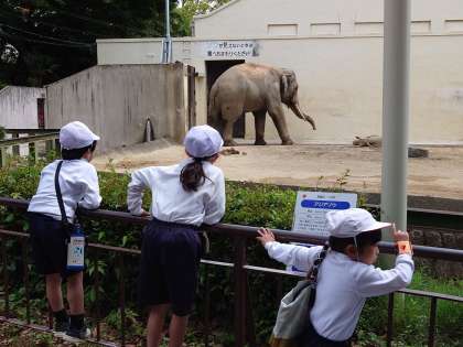 たくさんの大きな動物たちを目の前に、歓声を上げて観察しています。