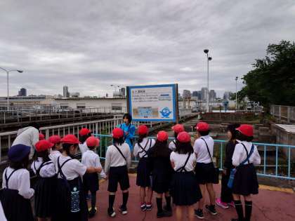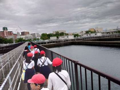 浄水場の広大な広さを体感しつつ、外の見学をしています。