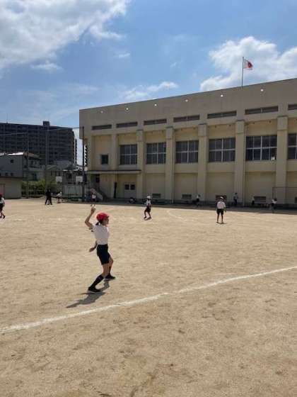 体力テストのソフトボール投げの練習をしました。玉入れの玉を使って、投げるフォームの確認をしました。