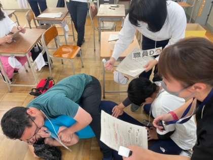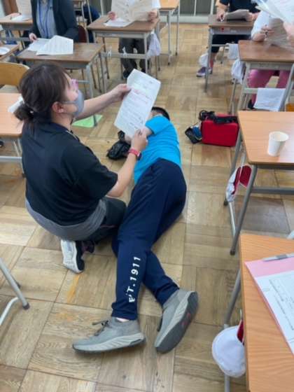 Aさんがアナフィラキシーショックを起こしたという設定で、シュミレーション、実習を行いました。エピペン接種の練習もしました。