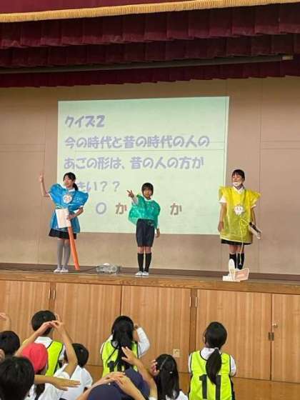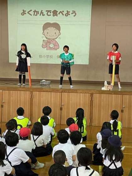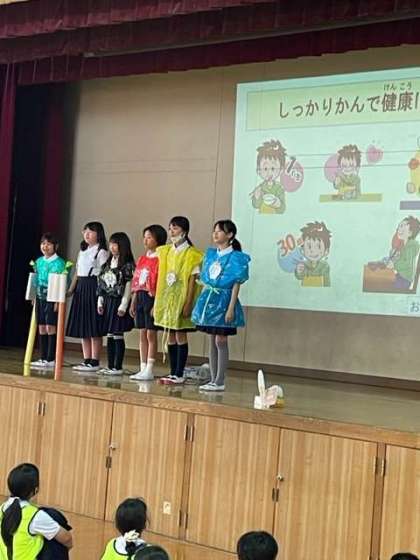 今日の児童集会は保健委員会の発表でした。劇形式でよく噛んで食べることの大切さを説明してくれました。