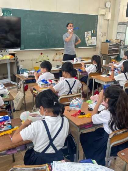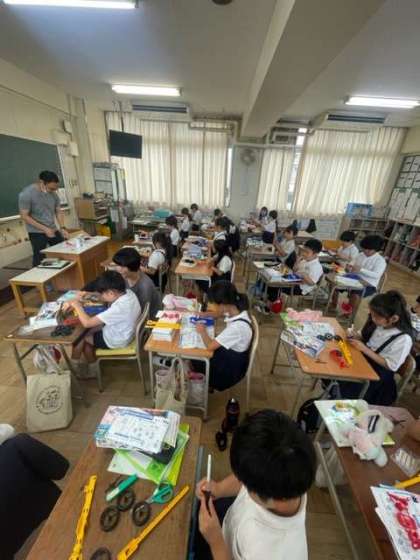 「風やゴムのはたらき」の学習で使用するウインドカーを配ってもらいました。先生の説明を聞きながら作っていきました。