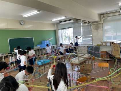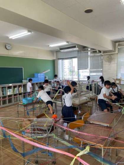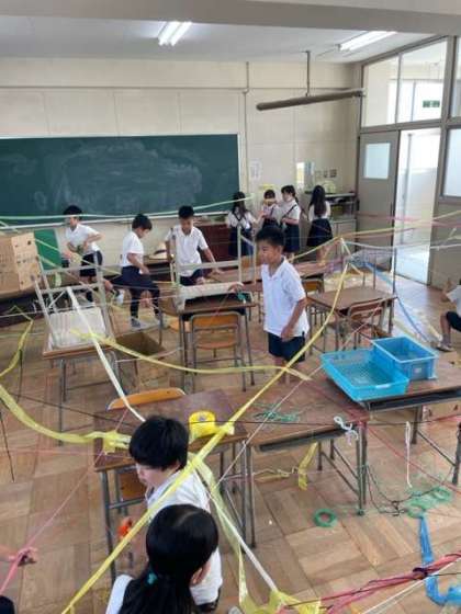 「ひもでつないで」の学習をしました。様々な色の毛糸やすずらんテープを使って教室を大変身させました。つなぎ方を工夫したり、色の組み合わせを考えたりしました。