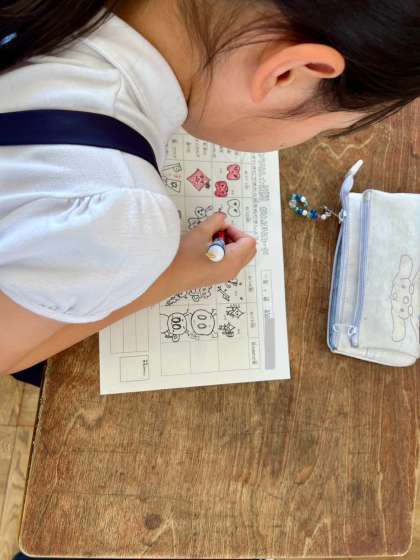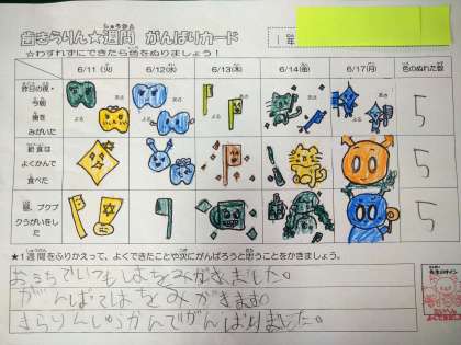 今年度は保健委員会が作った「頑張りカード」を使用し、朝晩のはみがき、よくかんで給食を食べる、給食後のブクブクうがいを忘れずに行うことができたら、色をぬるという取り組みを行いました。