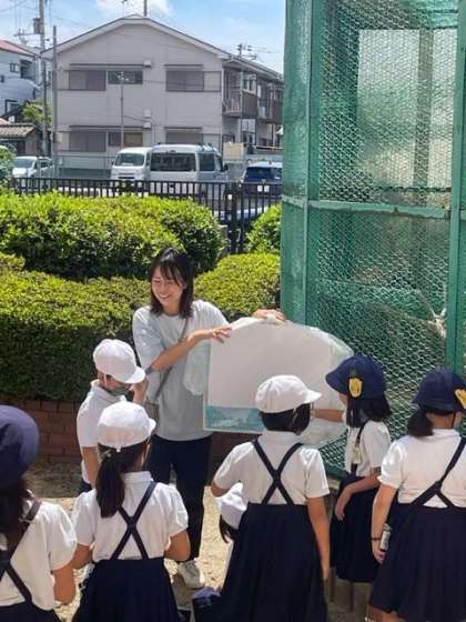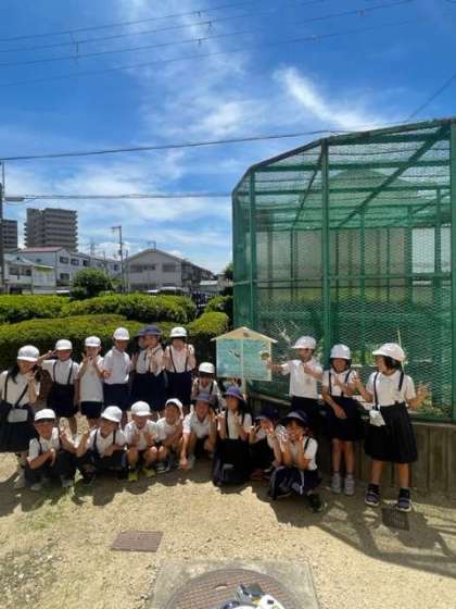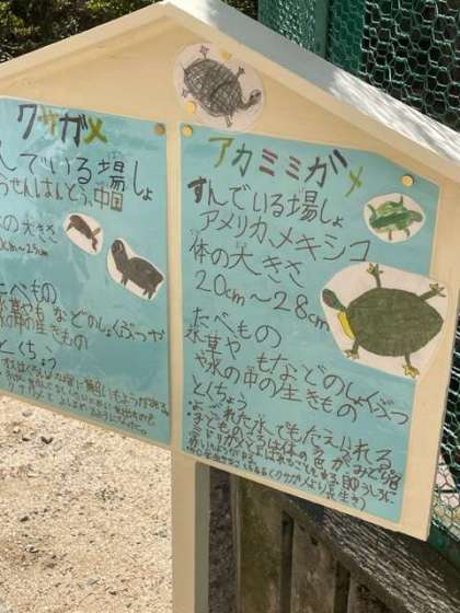 「どうぶつ園の かんばんとガイドブック」で学習したことをもとに、佃小学校で飼っているカメの小屋の看板をみんなで作りました。