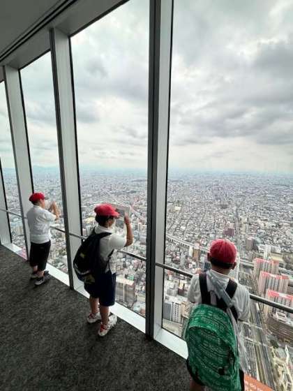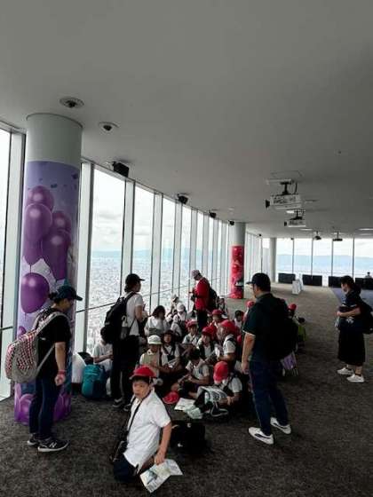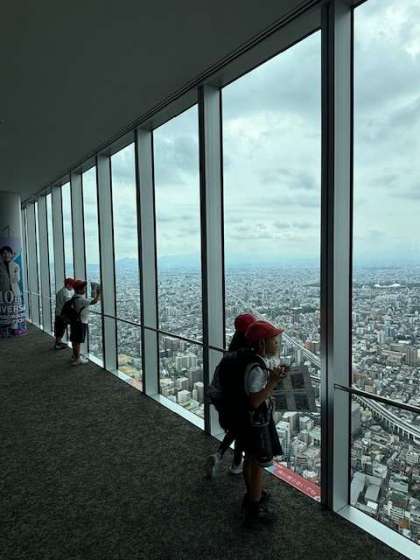 60階で大阪の街並みを見学しています。東西南北の様子を調べて、ワークシートに書いていきました。