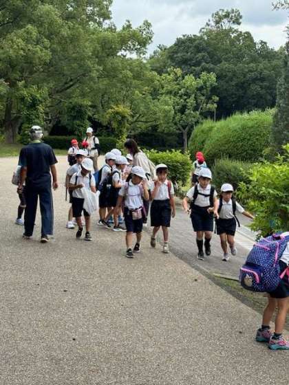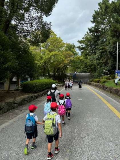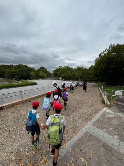 服部緑地公園に校外学習に来ました。公園に着くと、たくさんのどんぐりや松ぼっくりがあったので、みんなで拾いました。