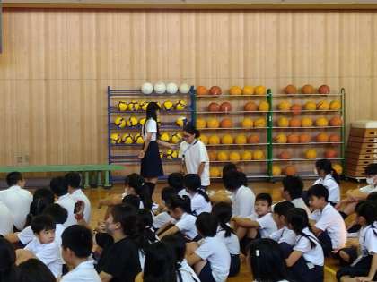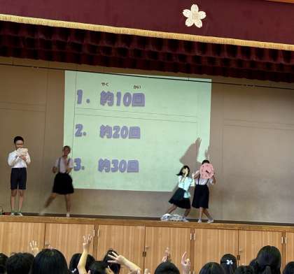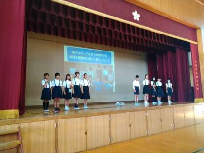 1日(火)の児童朝会時、保健委員会が「電子メディアの使い方について」のテーマで発表を行いました。