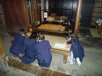 説明の後、昔の店の作りをそのまま展示しているところに移動し、ワークシートに答えながら楽しく見学しました。また、朝、昼、晩と、空が明るなったり、暗くなったりして、当時の様子を実感することができました。