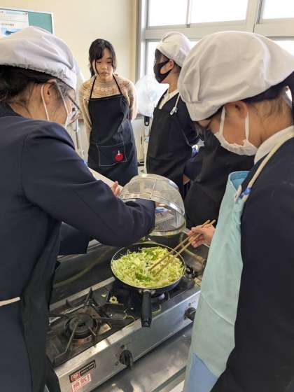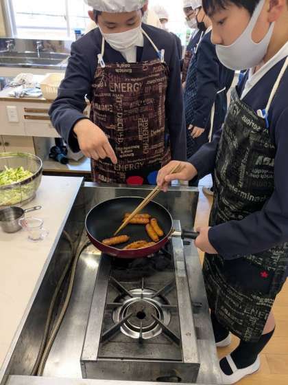 調理実習で、ホットドッグを作りました。キャベツを炒めて、ソーセージを焼きました。