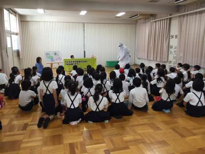 3日(金)、大阪市環境局の方に来ていただき、環境問題や3R(リユース・リデュース・リサイクル)、ゴミの分別などについて教えていただきました。紙芝居や劇でおもしろおかしく教えてくださり、子どもたちはとても楽しんで学習することができました。