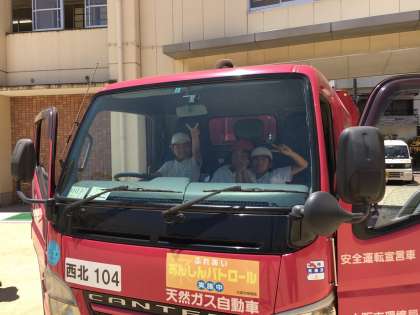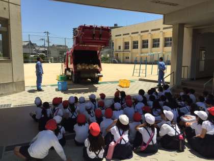 また、パッカー車も来校し、実際にゴミを入れる様子も見学しました。さらに、乗車体験や作業着の試着体験もさせていただきました。子どもたちは初めてのパッカー車にとても興奮し、活き活きと活動していました。