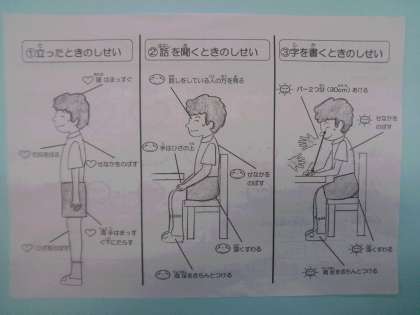 良い姿勢を保ち続けることは、身体の歪みをなくすだけでなく、集中力が持続し、学習の効率が上がる効果もあります。また、将来自分自身の健康にもつながってきます。ご家庭でもご指導いただきますようお願いします。
