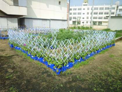学習園では1年生はアサガオ、2年生はプチトマトを育てています。子どもたちは朝、登校すると水やりをしています。芽が出てぐんぐん成長し、アサガオの花が咲きだしたものや、プチトマトの青い実ができ始めているのもあります。1学期の終わりごろにはどんなに成長して、花を咲かせ、実をつけるか楽しみです。「おおきくなあれ!」と一生けんめい水やりをしているので、きっと大きく育つと思います。