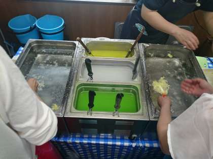 昼食後、道具屋筋で食品サンプルづくりをしました。先生の指導のもと、レタス、エビ天、かぼちゃとししとうの天ぷらを楽しくつくりました。