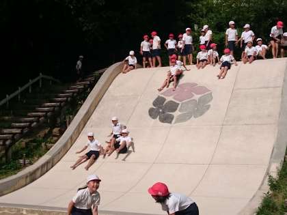 避難訓練をして、はだしの里で大きなすべり台などをして遊びました。